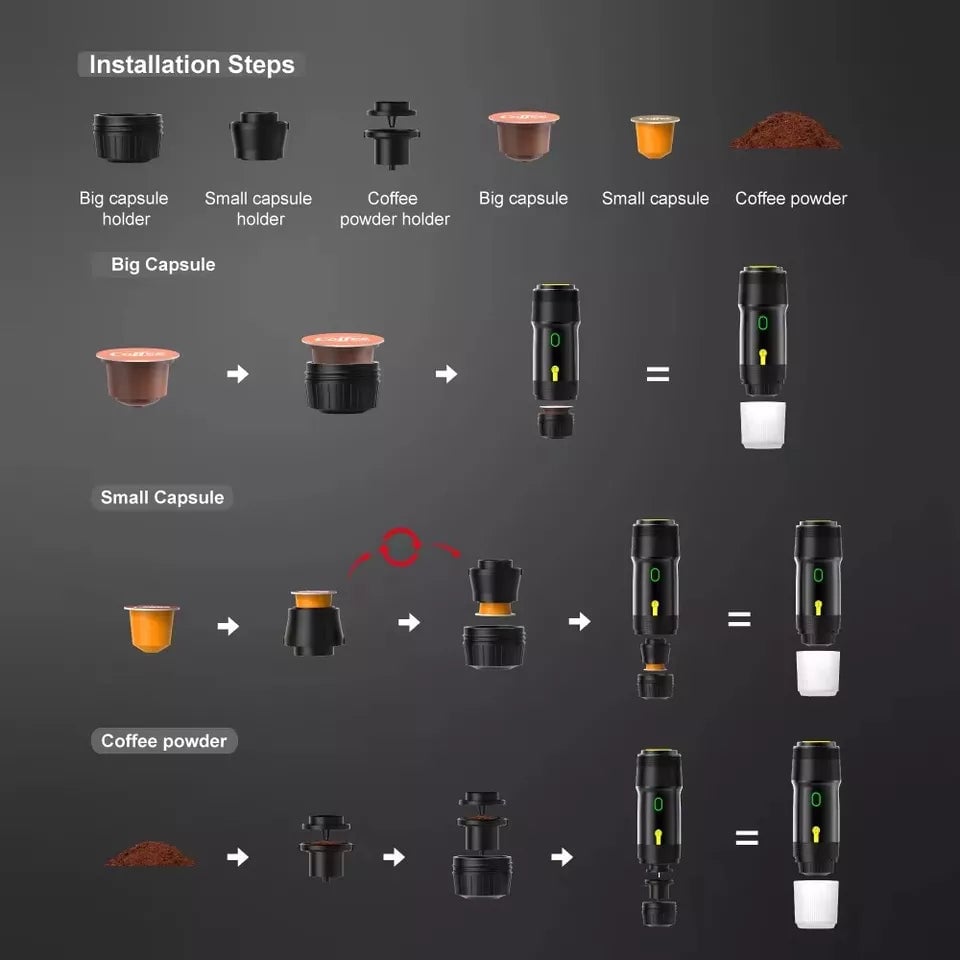 Answer - You will receive your new portable espresso machine with some very useful accessories. Such as a small cleaning sponge, coffee scoop, ground coffee adaptor. Small and large coffee pod adaptors allowing easy use with any type of coffee pod. As well as your user manual and Type C USB charging cable.